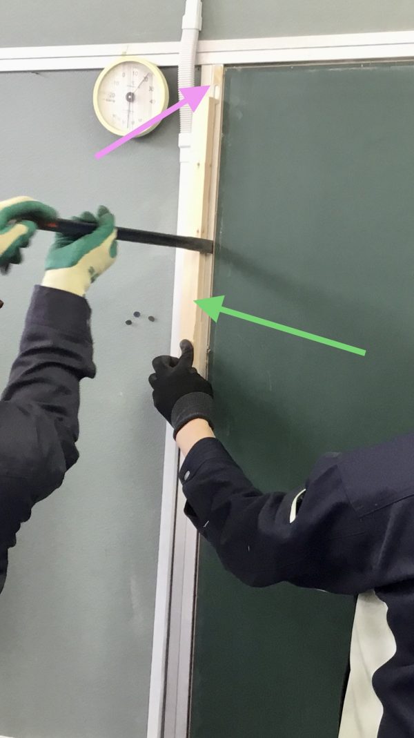 「ピンク矢印」の元々の土台のフレームは残りますので、傷を着けないよう場合によっては添木をして工具を初代黒板と2代目黒板の間に入れて剥がしていきます。