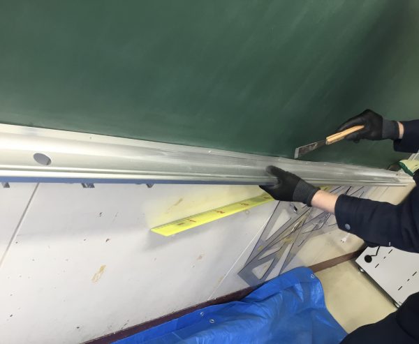 綺麗に剥がれる場合が多いそうですが、取材した現場はしっかりと接着していたため、最終的に黒板を折り曲げて剥がしました。
