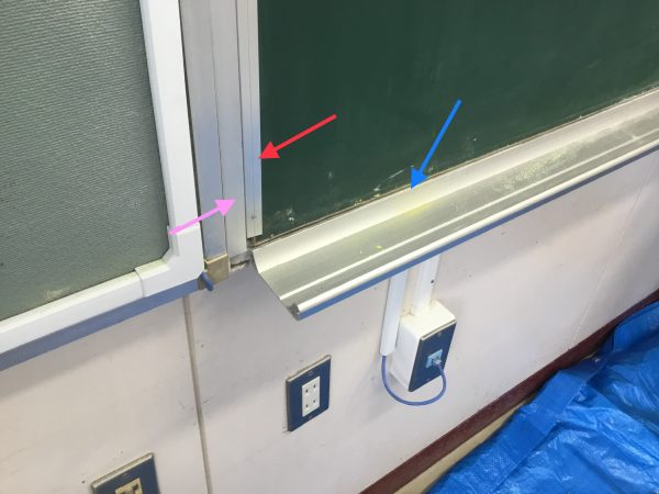 写真の「青色の矢印」は剥がし終わった部分です。よく見ると黒板の切れ目がむき出しになっています。