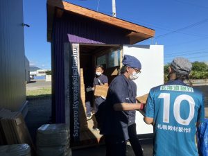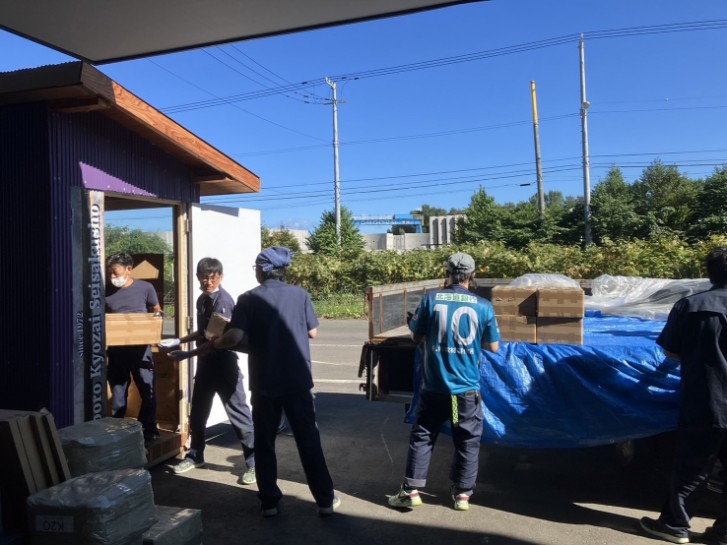 下の写真は届いた荷物を、小屋に運んでいる様子です。