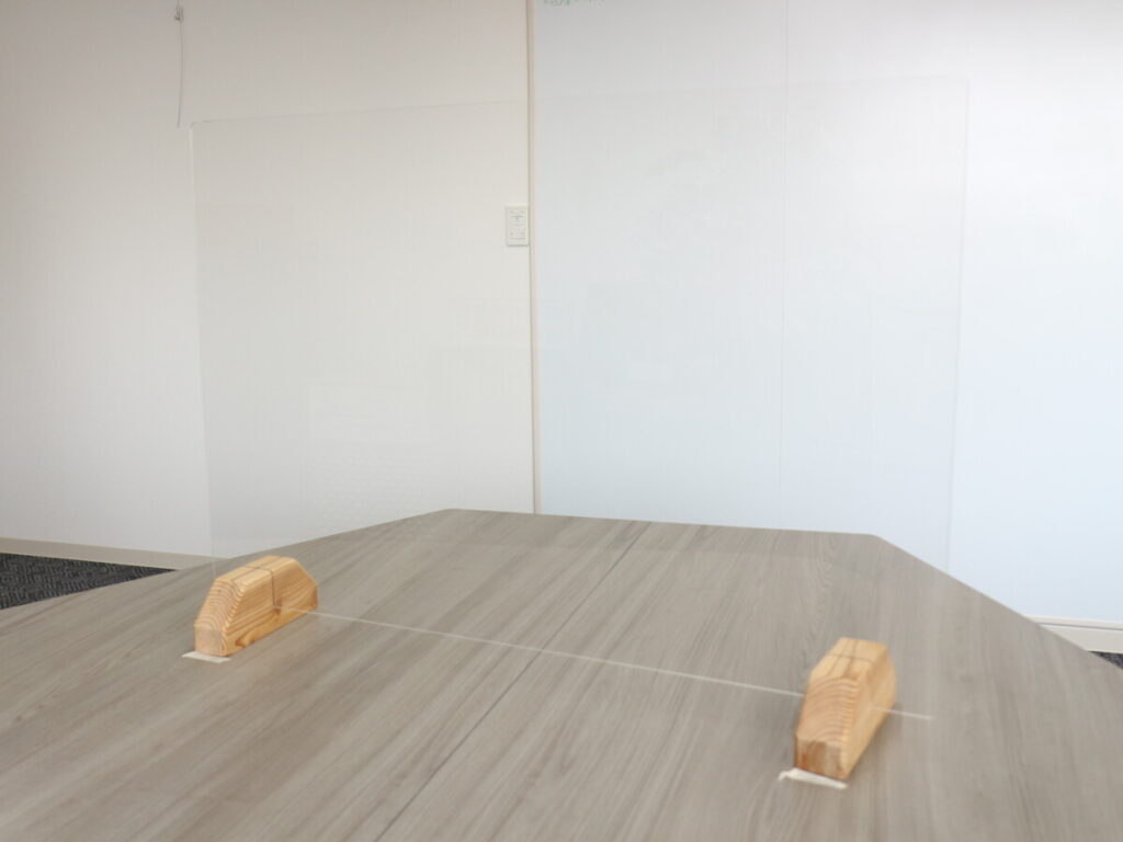 事務所のカウンターにあった飛沫防止のアクリルが、特製ホワイトボード裏は掲示板になっていました。