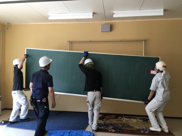 最近の教室の黒板はUDスライダーと言う物が取り付けされている所が多いので レバー操作で重たい黒板が、自由に高さが変えられるという優れものです。
