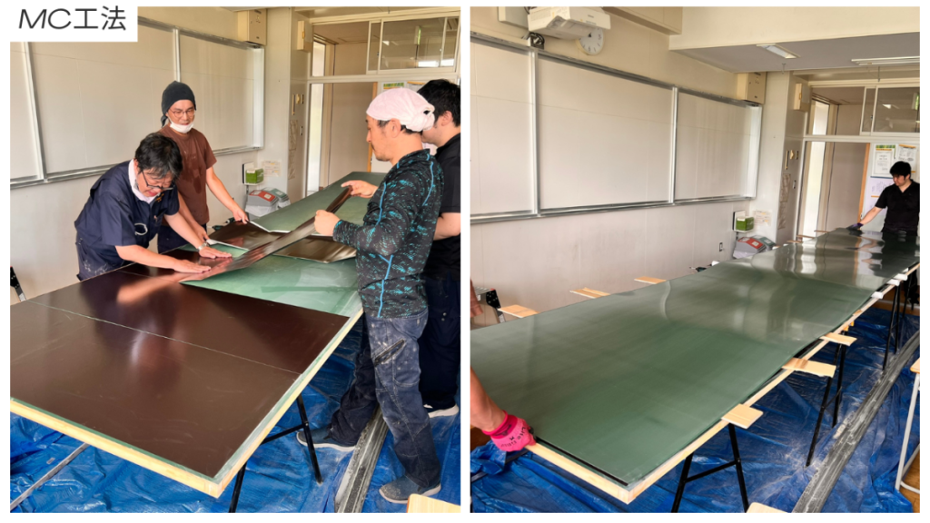 4名のチームで作業を開始しました。まず、1200mm×5400mmの大きな黒板の貼替です。このサイズの板は、1枚では教室に搬入できないため、「MC工法」という特殊な方法で分割して搬入し、貼り付けました。