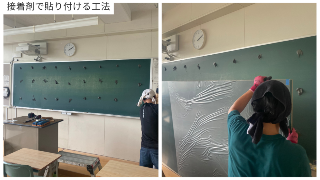 下地にマグネットシートを貼り付け、その磁力で新しい黒板やホワイトボードの表面材を固定する施工方法です。
