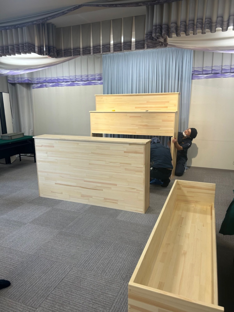 現地での作業時間を最小限に抑えるため、葬儀台のパーツはすべて自社工場で丁寧に製作しました。これにより、搬入後すぐに組み立てられる状態にし、スピーディーな施工を実現しました。