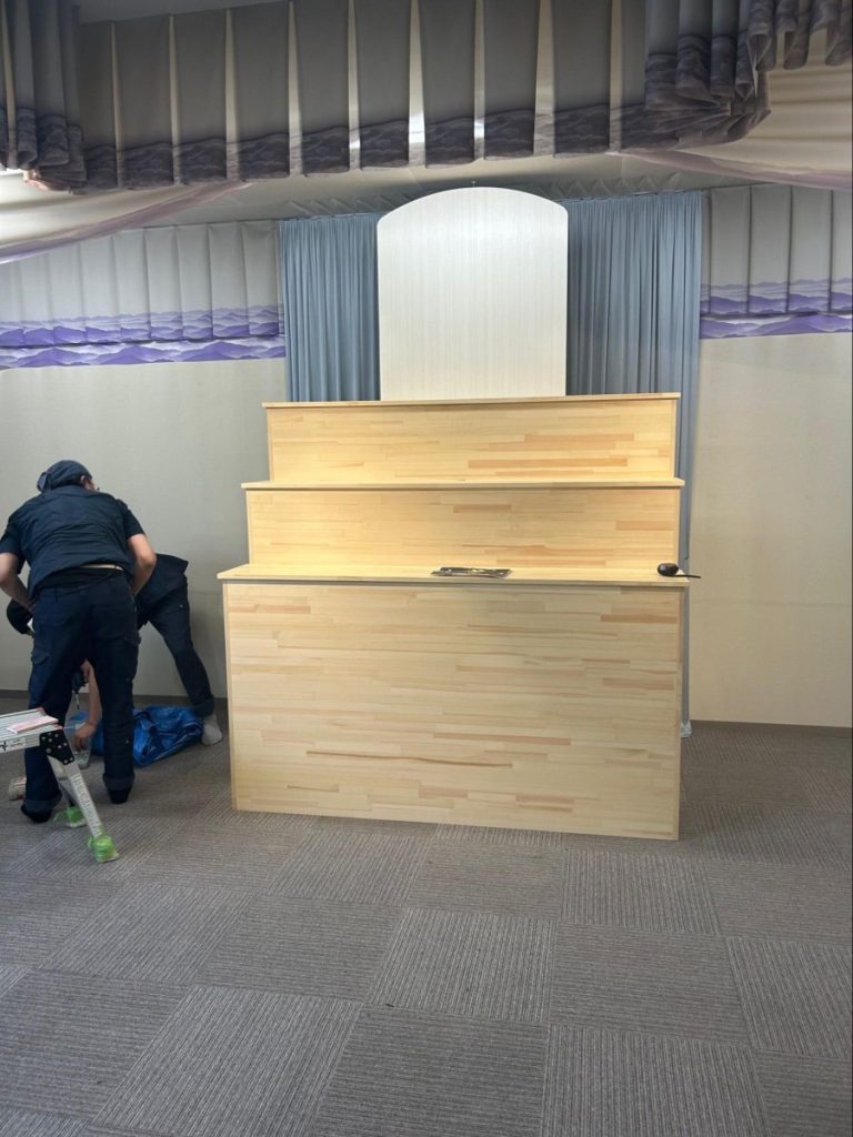 この度は、葬儀場の木工工事(葬儀台)をご依頼いただきました。営業中の葬儀場という特別な環境に配慮し、1時間半という短時間での施工を無事に完了いたしました。